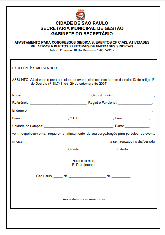 Formulário | Afastamento para Congressos Sindicais, Eventos Oficiais, Atividades Relativas a Pleitos Eleitorais de Entidades Sindicais