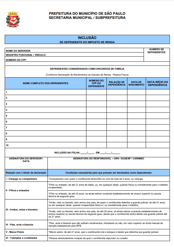 FORMULÁRIO | Inclusão Dependentes Imposto de Renda