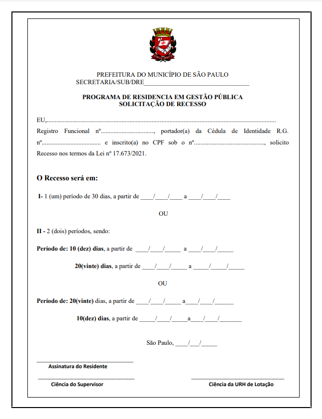 FORMULÁRIO | Solicitação de Recesso para Residente