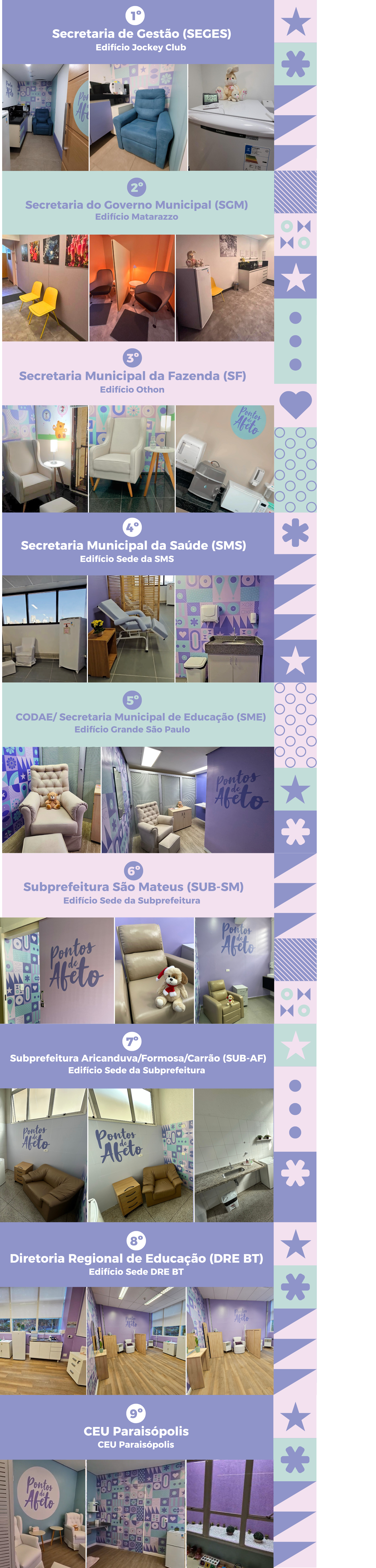 O Programa Pontos de Afeto da Prefeitura de São Paulo foi idealizado para dar apoio efetivo à servidora municipal lactante, dando condições para realizar a amamentação, extração e o armazenamento do leite materno. As salas do programa são privativas, acolhedoras e adequadamente equipadas. A iniciativa busca dar condições para que aconteça o que a Organização Mundial da Saúde (OMS) preconiza: que o leite materno seja a alimentação exclusiva dos bebês até os seis meses de vida, e, depois, que a amamentação siga de forma complementar até, pelo menos, os dois anos de idade. Para que isso de fato aconteça, as mães precisam receber apoio e infraestrutura adequada no retorno ao trabalho. É aí que o Programa Pontos de Afeto pode fazer a diferença. O programa estimula a criação de uma rede de salas de apoio à amamentação em dependências da Prefeitura. Com as salas, as servidoras devem se sentir confortáveis para fazer a extração do leite no horário de trabalho, bem como seguras para deixá-lo armazenado na sala pelo período que precisar.