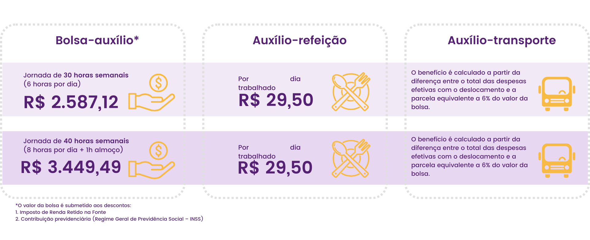 Sim, são descontados o Imposto de Renda Retido na Fonte e a contribuição previdenciária (Regime Geral de Previdência Social – INSS), calculados a partir do valor da bolsa-auxílio.